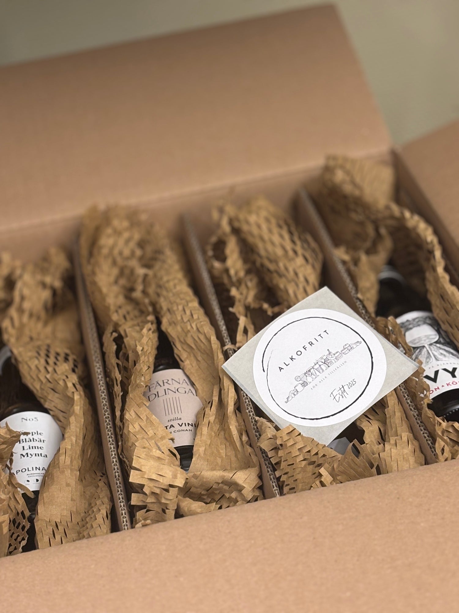 Alkofritts blandlåda med 12 svensktillverkade drycker från 12 svenska producenter